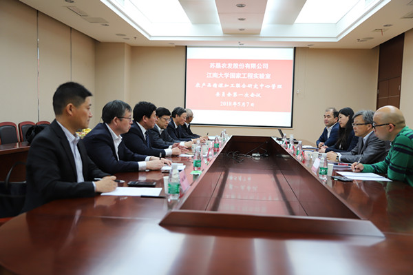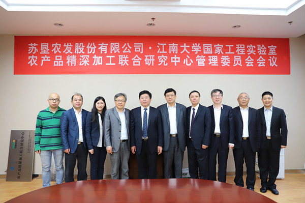 签约仪式结束后,苏垦农发股份公司-江南大学国家工程实验室农产品精深加工联合研究中心管理委员会召开了第一次会议。会议审议通过了联合研究中心章程;通过了联合研究中心、主任、副主任、首席科学家建议人选名单;通过了年度工作计划及科研项目立项计划。