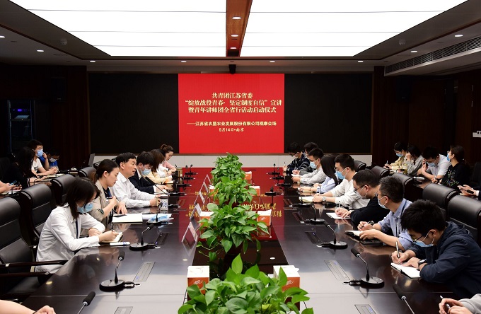 5月14日,苏垦农发组织观看共青团江苏省委“绽放战役青春坚定制度自信”宣讲暨青年讲师团全省行活动启动仪式。公司驻宁子公司、总部团员青年共60人参加。公司党委委员、工会主席倪志愿出席观摩会并讲话。