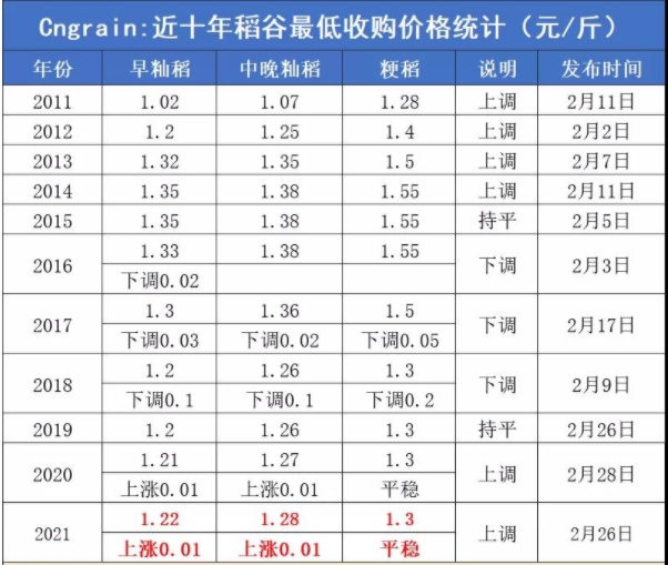 2021年国家继续在稻谷主产区实行最低收购价政策。综合考虑粮食生产成本、市场供求、国内外市场价格和产业发展等因素,经国务院批准,2021年生产的早籼稻(三等,下同)、中晚籼稻和粳稻最低收购价分别为每50公斤122元、128元和130元。根据近几年稻谷最低收购价收购数量,限定2021年最低收购价稻谷收购总量为5000万吨(籼稻2000万吨、粳稻3000万吨)。