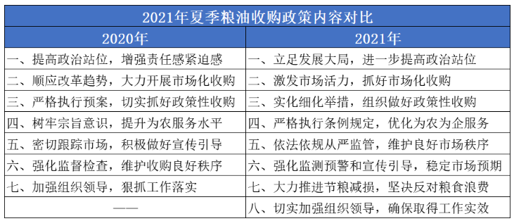 5月6日国家粮食和物资储备局下发《关于切实做好2021年夏季粮油收购工作的通知》,当前我国粮食市场形势错综复杂,夏粮收购作为全年收购的首战,组织做好夏粮收购工作至关重要。与2020年相比,今年取消了粮食收购资格许可相关规定,《通知》指出严禁变相审批,不得“明放暗不放”。此外针对市场化收购和政策性收购两方面,依据中央经济工作会议、中央农村工作会议和中央一号文件,国家粮食和物资储备局作出更为细化的部署安排。《通知》还增加了节粮减损、粮食浪费方面的内容。