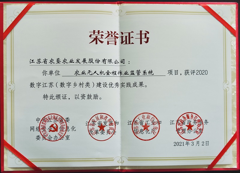 数字江苏建设优秀实践成果评选由省委网信办、省发展改革委、省工信厅等四部门联合组织,旨在贯彻落实习近平总书记关于网络强国的重要思想,进一步总结宣传推广我省信息化发展的成功经验和生动实践,加快推进数字江苏建设。本次评选工作共征集459个成果项目,最终确定60个项目入选年度“数字江苏建设优秀实践成果”。在集团企划部指导下,苏垦农发精心组织成果总结和报奖工作,农业无人机作业质量监管系统建设项目获评2020年数字江苏建设(数字乡村类)优秀实践成果,体现了公司智慧农业建设水平,展示了江苏EVO视讯官方网站形象。