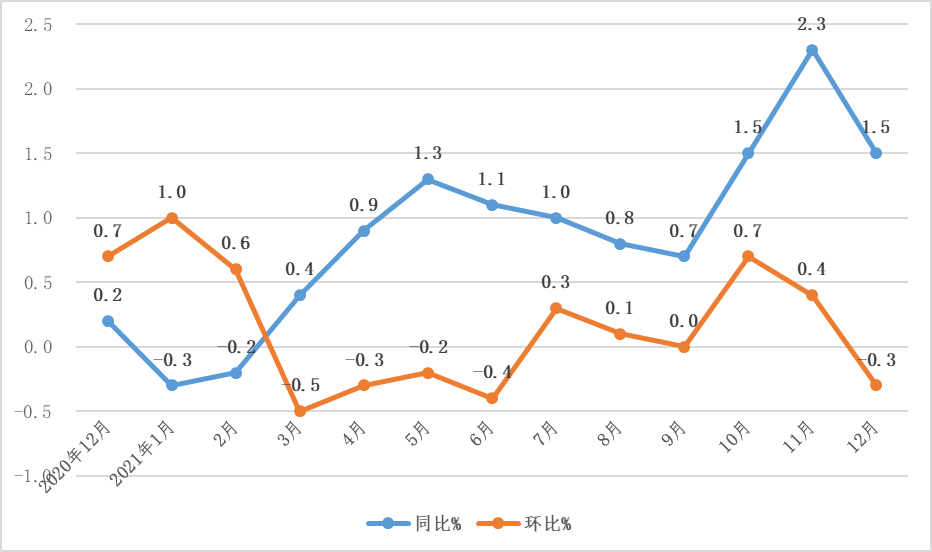 2021年12月份,全国居民消费价格同比上涨1.5%。其中,城市上涨1.6%,农村上涨1.2%;食品价格下降1.2%,非食品价格上涨2.1%;消费品价格上涨1.5%,服务价格上涨1.5%。