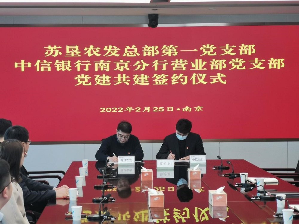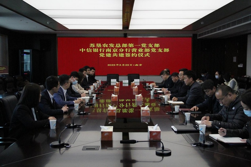 2月25日,苏垦农发总部第一党支部与中信银行南京分行营业部党支部举行党建共建签约仪式。签约前,苏垦农发总部第一党支部书记刘刚和中信银行南京分行营业部党支部书记张磊各自介绍了支部基本情况,并就党员队伍建设、党建工作开展以及党建业务融合促进等方面内容作交流。随后,双方代表签订《党建共建协议书》,并互赠党建书籍。