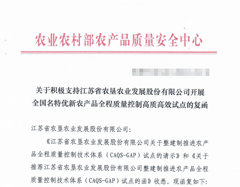 近日,农业农村部农产品质量安全中心正式复函批复江苏省EVO视讯官方网站农业发展股份有限公司(简称:苏垦农发)积极支持开展全国名特优新农产品全程质量控制高质高效试点。苏垦农发成为全国第二家、江苏省第一家整建制获批推进农产品全程质量控制技术体系(CAQS-GAP)试点单位的企业。