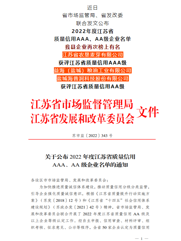 2022年11月30日,江苏省市场监督管理局与江苏省发展和改革委员会发布2022年度江苏省质量信用AAA、AA级企业名单,麦芽公司获评江苏省质量信用AAA级。