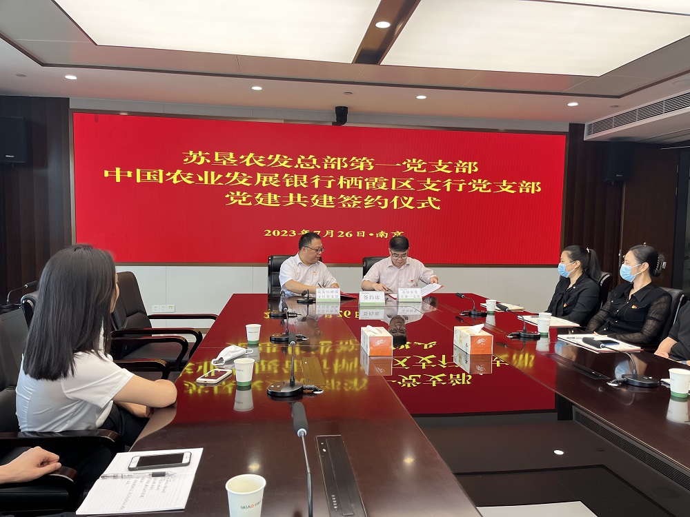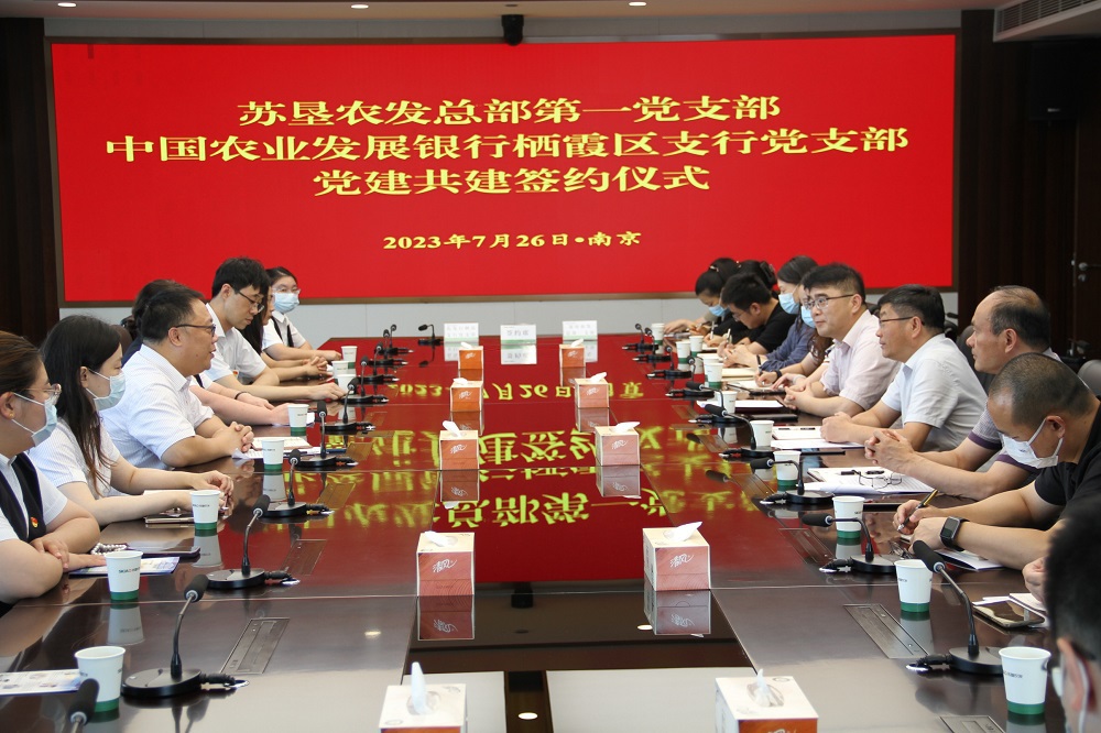 活动开始,双方支部共同开展第一议题学习,苏垦农发总部一支部书记刘刚领学了习近平总书记在江苏考察期间发表的重要讲话精神。农发行栖霞支行党支部书记丁全楠领学了习近平总书记在《求是》杂志上发表的《健全全面从严治党体系,推动新时代党的建设、新的伟大工程向纵深发展》重要文章精神。苏垦农发财务总监陶应美介绍了公司与金融机构业务开展情况,对公司深化与农发行在优化省级储备粮业务、拓展农业政策性金融服务等方面合作提出建议。随后,双方支部紧扣“以学促干”开展了座谈交流,就加强党建工作及银企业务合作作了深入探讨等。双方一致表示,苏垦农发与农发行栖霞支行肩负保障国家粮食安全、落实“藏粮于地、藏粮于技”等国家重大战略上有着共同使命责任,希望通过开展党建共建,进一步推动党建与业务融合,深化银企合作。会上,双方党支部还签订了《党建共建协议书》。