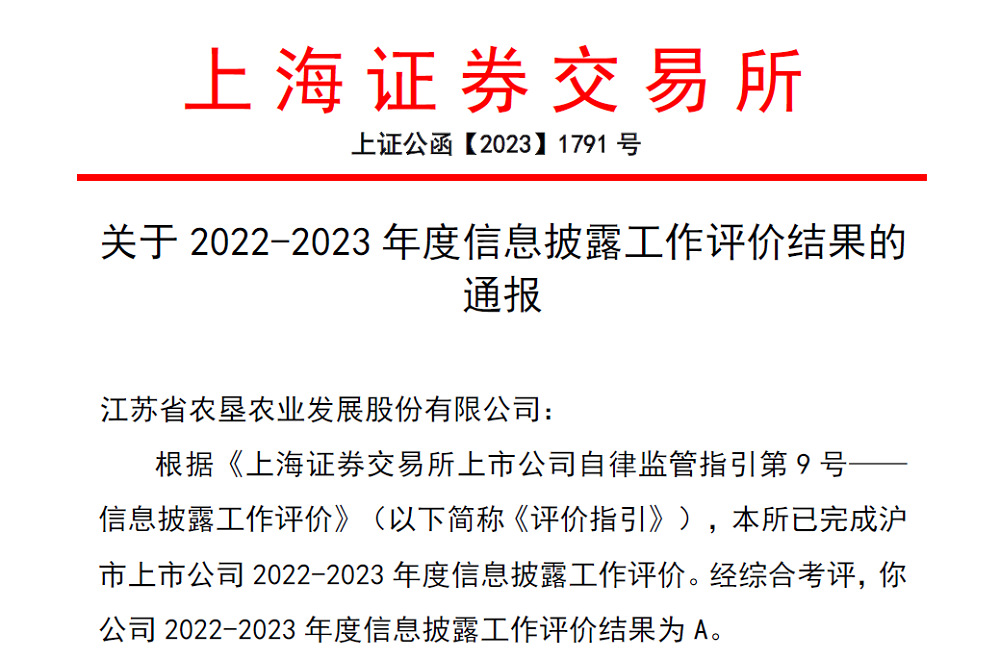 近日,上海证券交易所公布沪市主板上市公司2022-2023年度信息披露工作评价结果,苏垦农发(股票代码:601952)再次荣获信息披露工作“A”级评价(最高级),这也是公司连续第四年获此殊荣,充分体现了证券监管机构对公司法人治理、信息披露和投资者关系维护等方面工作的高度肯定。