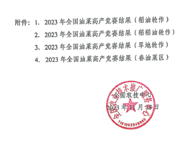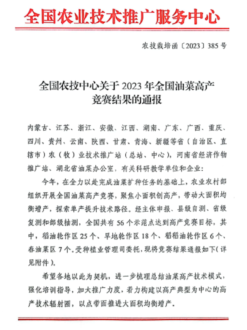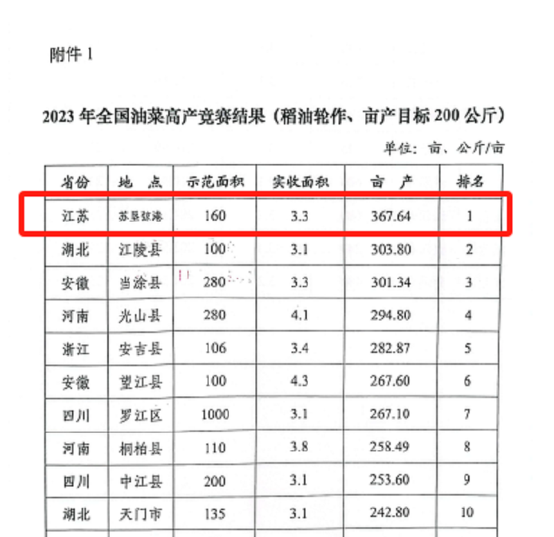 • 近日,农业农村部全国农业技术推广服务中心公布了2023年全国油菜高产竞赛结果,苏垦农发弶港分公司百亩攻关方以亩产367.64公斤刷新全国稻油轮作油菜高产记录,较原纪录提高43.77公斤,荣获本次全国油菜高产竞赛全组别第一名。