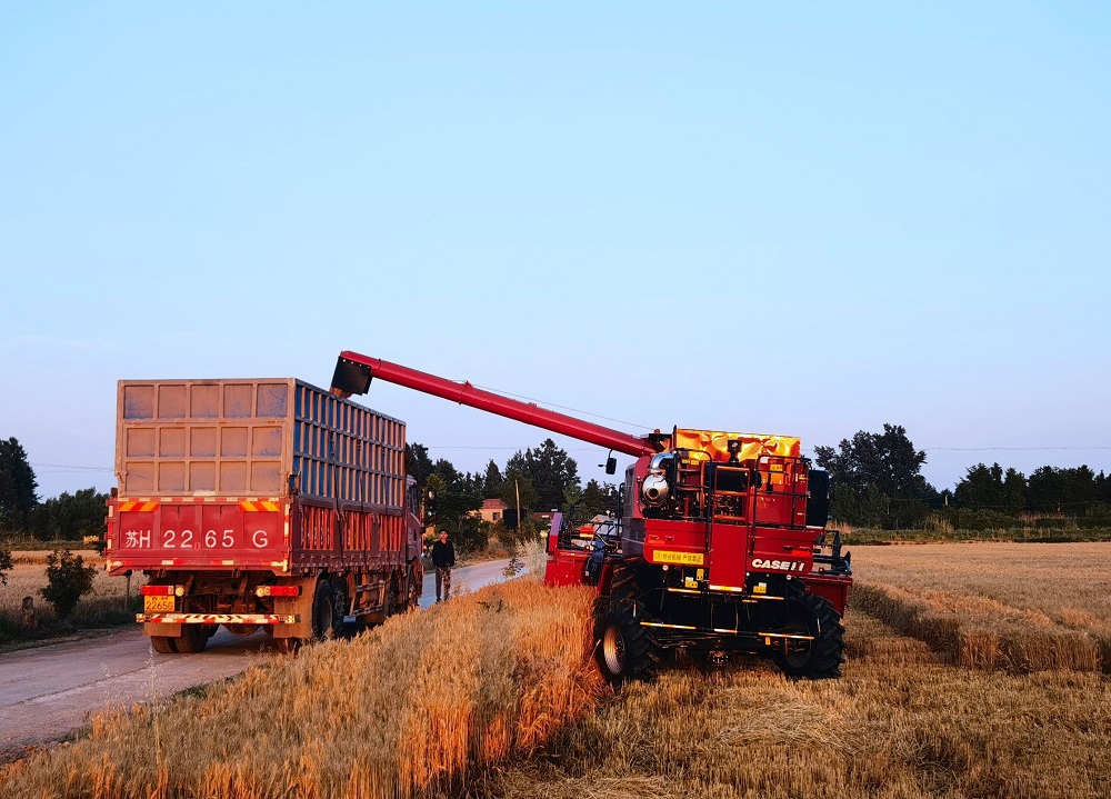 5月27日下午5点,一辆崭新的凯斯4099型号收割机在苏垦农发宝应湖分公司三生产区16队田间来回穿梭,一片片金黄的麦穗收入“囊”中,收割机身后留下切碎均匀的麦秸秆,宝应湖喜开“第一镰”,麦田间的丰收画卷徐徐展开。