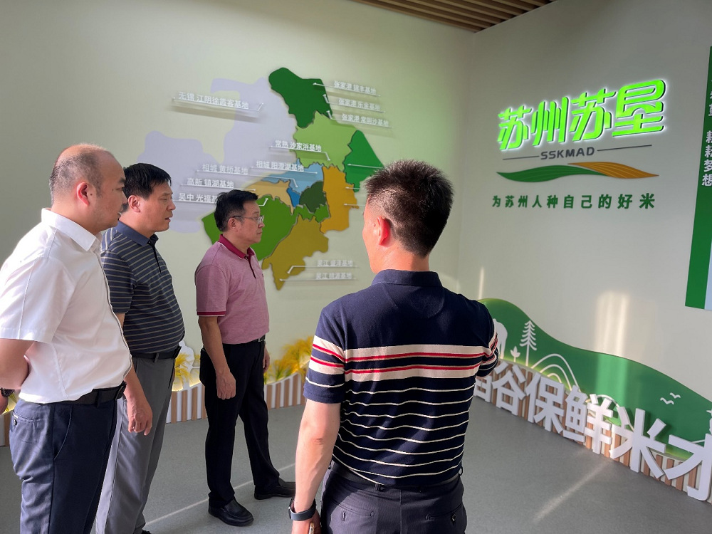 7月16日,省粮食和物资储备局党组成员、副局长李德,省粮油学会理事长夏春胜等领导到苏州苏垦展示店调研指导工作。