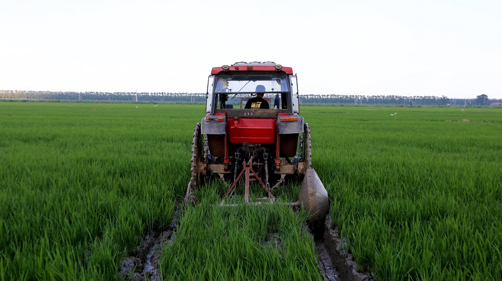 清晨五点,天刚蒙蒙亮,海南生产区43大队水稻田里,工作人员已经开始忙碌起来。只见在碧绿茂盛的稻田中,农机驾驶员正进行水稻丰产沟压沟作业,伴随着机器阵阵轰鸣声,不一会儿,一条条整齐笔直的丰产沟就赫然呈现在眼前。“建好水稻丰产沟是解决排水降涝、实现高产稳产的关键性生产措施,有了两台丰产沟压沟机的助力,海南生产区4750亩水稻,5天就可以全部完成建沟工作,科技机械的加入,既解决了人工少、地块多的问题,又能达到整齐度高、深浅一致的效果,为后期烤田管理、排水通畅打好基础,真正实现一举多得。”海南生产区技术员孙正说。