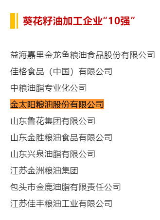 近日,中国粮食行业协会根据《关于进行2024年度重点粮油企业和各省粮油加工业专项调查的通知》(中粮协〔2024〕2号),组织行业专家开展了2023年度重点粮油企业专项调查,按照产品销售收入、产量、产能、利税、利润等指标综合审定,公示了2023年度重点粮油企业专项调查结果。金太阳粮油股份有限公司再度入选食用油加工企业“50强”、玉米油加工企业“10强”、稻米油加工企业“10强”、葵花籽油加工企业“10强”、亚麻籽油加工企业“10强”等5项榜单,首次入选菜籽油加工企业“10强”榜单。